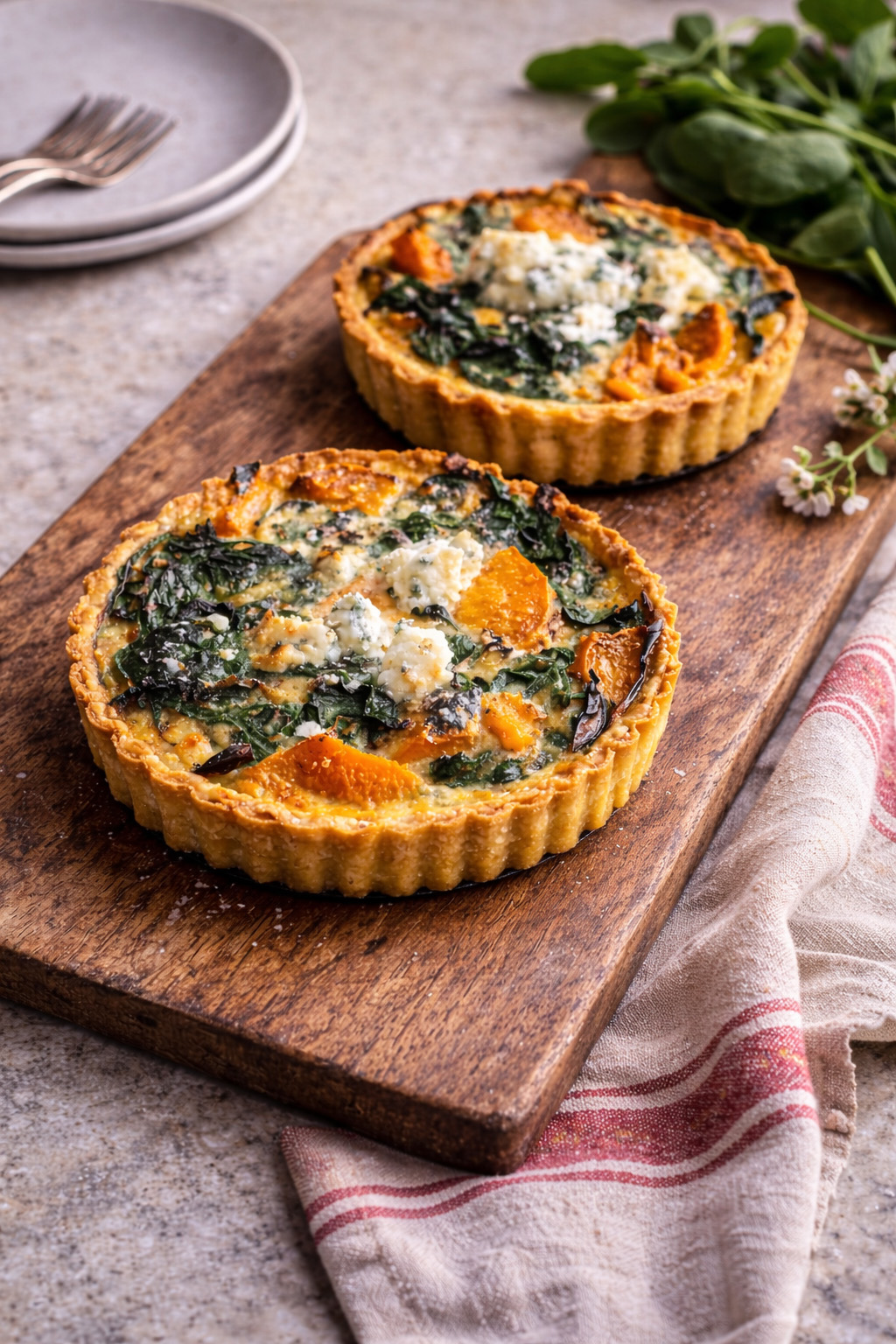 Golden Pumpkin, Wilted Spinach & Gorgonzola Tarts